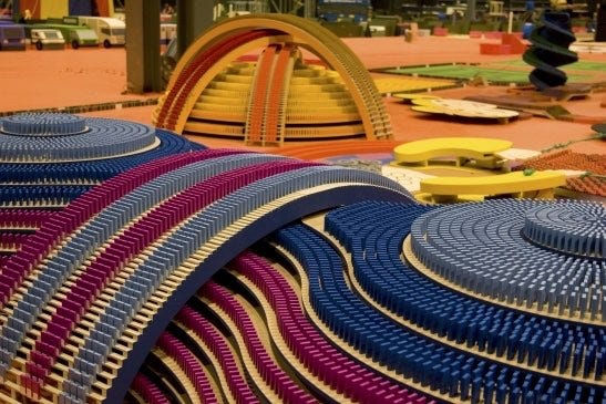 We know what happens- you know one down, all of them will topple one after the other very satisfyingly. This is what happened on Domino Day 2009, one domino triggered the fall of almost four and a half million dominos that were lined up, which unleashed more than 94,000 joules of energy!!