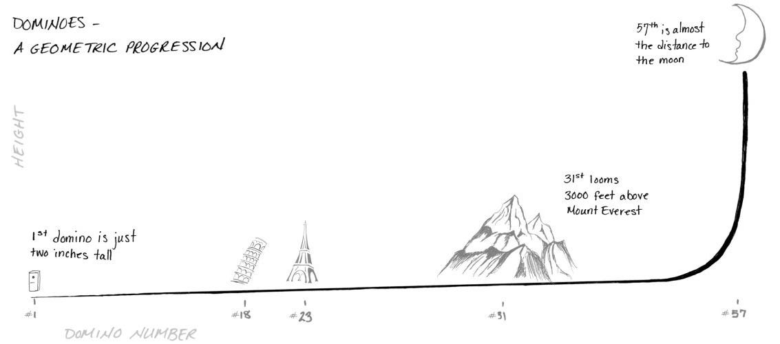 Now, Imagine a domino piece was 1 inch tall, and progressively each piece lined up gets 50% larger.